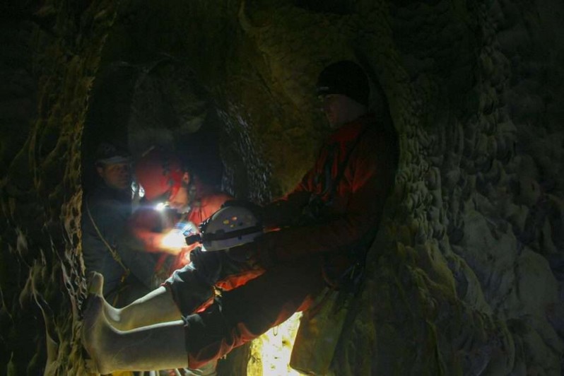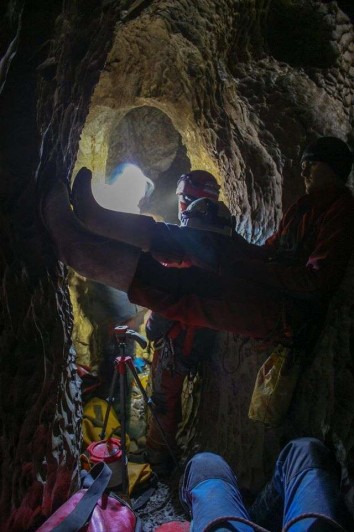 Po wywspinaniu ok. 5-6m pionowej ściany dotarliśmy do korytarzyka opadającego w dół do Sali Zejściowej która kończy się studnią opadającą do znanego już nam korytarza prowadzącego do syfonu Kociego.