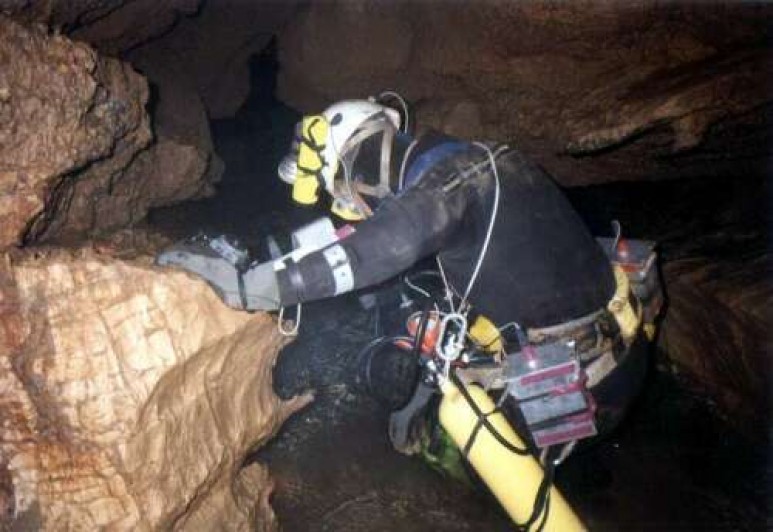 The deepest cave dives took place in Mietusia cave. There are two separate, vertical sequences of the pits at the down parts of this cave. One of them is called Wielkie Kominy (Great Chimneys) and the second Ciasne Kominy (Narrow Chimneys). For many years these two sumps remained unconnected, but many clues indicated that the connection is possible. The exploration in Narrow Chimneys was undertaken by cavers from club Sekcja Grotołazów Wrocław. The bottom of the last pit is divided into two separate lakes. Wiktor Bolek explored the south one. Within the years 1996-98 four assaults were made. On the dive on 29.12.1998 the depth of -70m was reached at the distance of 135m from the lake surface. It was a definite end of the exploration. The dive lasted 76' including 53' decompression. Trimix was used as bottom gas, air as travel mix and oxygen for final decompression.