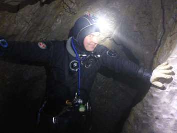The last expedition was carried out in December 1998. Norbert dived in Northern lake and explored 90m long corridor. There he eventually found a line from Great Chimneys at -28m in the horizontal collector. On the way back the water got muddy and Norbert find difficult to pass a restriction. He tried several times. At last he turned his back down and stretched his arm as much as possible. The following the line he managed to get through.