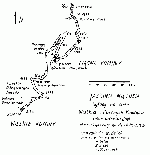 The sumps at the bottom of Narrow Chimneys were explored mainly by Wiktor Bolek and Norbert Ziober, during three last years. Wiktor explored southern branch of the sump to the depth of -63m. Norbert explored North-Western part, but no connection was found.