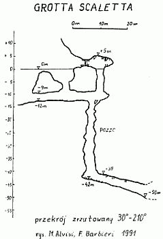 Prawdopodobnie wszyscy mają mało powietrza w butlach. Nie posiadają ze sobą kołowrotka z poręczówką i mają tylko dwie latarki na trzech. Do tego tylko Witold ma komputer. Jaskinia schodzi na -43m ciasnym korytarzem, który u podstawy rozszerza się tworząc małą salkę, w której zbiegają się inne korytarze mniej więcej równoległe do studni wejściowej. Cała trójka, po zejściu na -35m, prawdopodobnie nie może znaleźć drogi powrotnej w tym małym labiryncie i szybko kończy się im powietrze. Ich koledzy na powierzchni po daremnym oczekiwaniu, wracają do Palinuro aby zaalarmować kapitanat portu. Od tej pory zaczynają się długie i bolesne poszukiwania ciał przez nurków z miejscowego klubu "Pesciolino" i VVFF (strażacy).