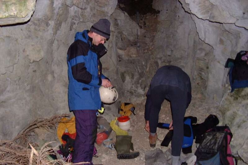Do jaskini poszliśmy w sobotę 14.12.2002 w składzie: Wiktor Bolek jako kierownik zamieszania, Włodek Szymanowski w roli transportu (spłaciliśmy dług dzień później taszcząc szpeje pod otwór Wielkiej Śnieżnej), Arnold Paliński z Justyną Błaszkowską i ja.
