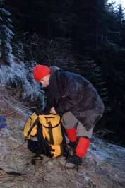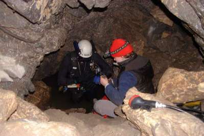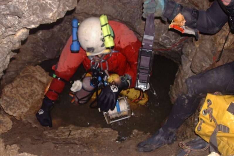 Pogoda była piękna - mało śniegu i lekki mróz. Przebraliśmy się pod otworem (Wiktor nurkował "na sucho", Arnold i ja w piankach), sprawdziłem jeszcze raz automaty i zanurzyłem się w czystej wodzie. Pierwszy syfon, choć krótki, dostarczył mi sporych wrażeń. Okazało się, że nurkowania w jaskini nie da się porównać z żadnym innym sportem. Po prostu - to jest to! Po wynurzeniu się z wody usiadłem wygodnie i czekałem na resztę towarzystwa. Po pewnym czasie wyszedł się Wiktor, chwilę później Arnold. Niestety, jeden z automatów Arnolda odmówił współpracy, więc w stronę drugiego syfonu ruszyliśmy z Wiktorem we dwójkę. Po przejściu krótkiego meandra i zejściu na dno szczeliny zobaczyłem wodę i znikającą pod jej powierzchnia poręczówkę. Sprawdziłem czy jest dobrze zestabilizowana i znowu woda zamknęła się nade mną.