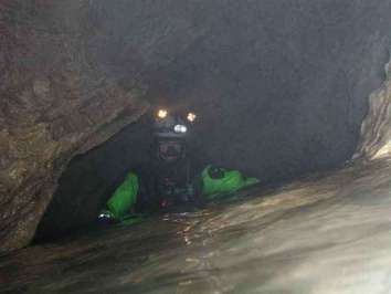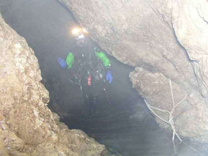 Przenurkowanie dwóch wstępnych syfonów, zaporęczowanie i ospitowanie zjazdu do Jeziorka by nie korzystać ze sparciałych lin poprzedników zajęło sporo czasu. Zanurzenie w X było ciekawym doświadczeniem. Zaskoczeniem była nietypowo zimna woda, chociaż jesteśmy przyzwyczajeni do zimnych jaskiniowych wód, tutaj przerosło to naszą wytrzymałość. Woda musiała mieć między 0-2 st. C, co znacznie spotęgowało stres nurkowania. Mirek przepłynął niepokonany wcześniej zacisk, kończący się biegnącą w górę pochyłą szczeliną. Ja dopłynąłem przy 30 cm widoczności do zacisku, skąd chcąc jeszcze zobaczyć inne syfony tatrzańskie postanowiłem się wycofać. Stwierdzono, że tą drogą wodną Śnieżnej pogłębić się nie da.
