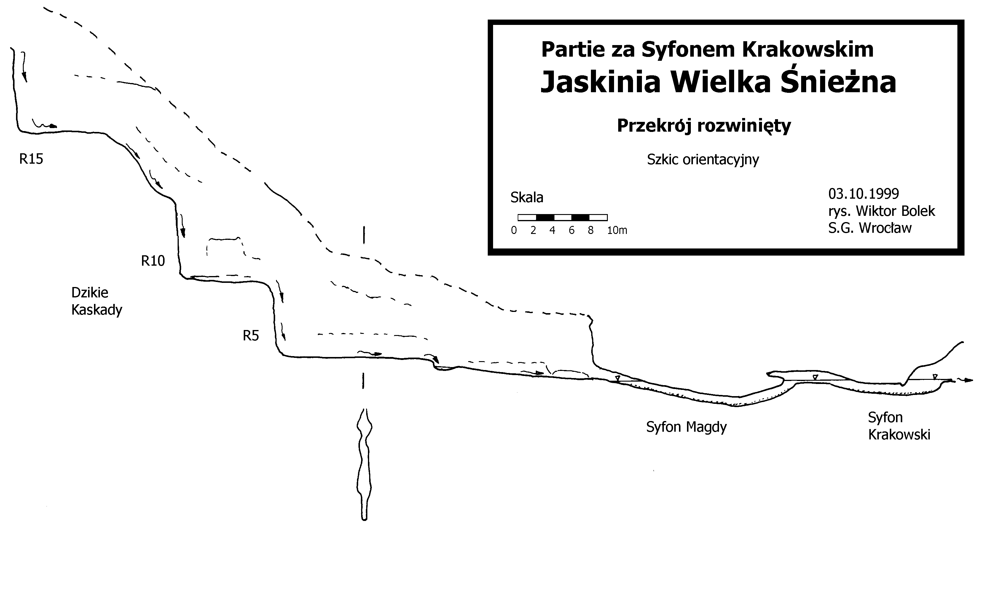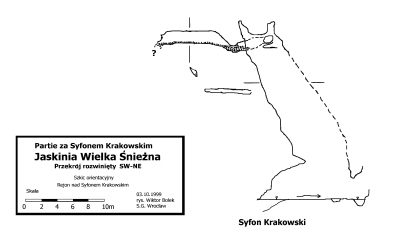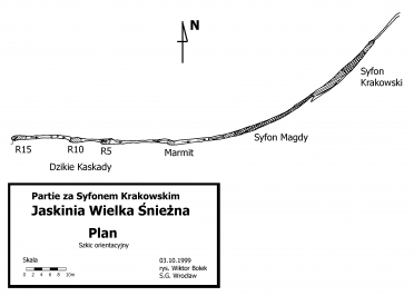 Dlatego też kluczową sprawą dla postępu eksploracji jest znalezienie suchego obejścia Syfonu Krakowskiego i Syfonu Magdy. Optymistyczne myśli należy wiązać z eksploracją górnych partii szczeliny nad jeziorkiem wejściowym do Syfonu Krakowskiego. Znajdujący się tam korytarzyk, jego przekrój i dotychczasowy kierunek wskazuje na to, że może rozwijać się w tej samej szczelinie, co szczelina za syfonami.