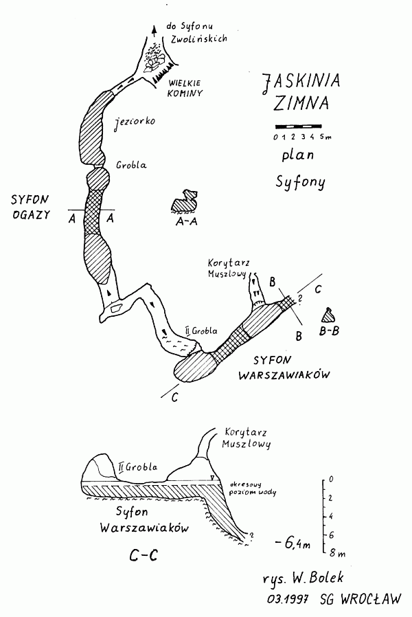 Sprawnie doszliśmy na miejsce i przebraliśmy się. Ostrożnie przepłynęliśmy przez dwa pierwsze syfony, aby jak najmniej zmącić wodę. W syfonie Ogazy zwracałem szczególną uwagę na wszystkie szczegóły, które mogłyby wyjaśnić śmierć Lebeckiego. Mój niepokój wzbudziła szczelina w stropie. Czy można się tam zaklinować? Na razie przerwałem dalsze oględziny i poszliśmy do Syfony Warszawiaków. Tu okazało się, że poziom wody jest bardzo niski. Do lustra musieliśmy się opuścić z metrowego przewieszonego prożka. Syfonu w zasadzie nie było. Do Korytarza Muszlowego można było przepłynąć po powierzchni. Pozostało nam już tylko zbadanie bocznej odnogi. jako pierwszy wpłynął tam Michał. Korytarz szybko opadał w dół. Dno było pokryte gruba warstwą gliny. Na głębokości 4m przekrój zmniejszył się na tyle, że Michał z butlami na plecach nie był w stanie już się tam zmieścić. W czystej jeszcze wodzie dostrzegł, że zaraz za zwężeniem korytarz rozszerza się. Po tym wynurzył się. Mimo zachowywanej ostrożności nie udało się uniknąć zmącenia wody. Następną próbę podjąłem ja. Wziąłem tylko jedną butlę zamocowaną na boku. Za poręczówkę posłużyła mi linka zwisająca z Korytarza Muszlowego. Zanurzałem się zupełnie po omacku. Korytarz stawał się coraz węższy, jednak mogłem swobodnie poruszać się dalej. Obmacywałem strop nad sobą. Miał kształt kąta rozwartego, który przechodził w szczelinę. Była ona na tyle szeroka, że źle zastabilizowana poręczówka mogła się tam wspaniale wklinować. Jednak bliżej dna z twardej gliny korytarz był wystarczająco szeroki. Tu skończyła się linka. Widoczność była doskonale zerowa. Nie udało mi się odczytać żadnego z przyrządów. Wynurzyłem się. Dopiero tutaj mogłem, odczytać maksymalna głębokość, jaką zarejestrował komputer. Wynosiła 6.4 metra. Nie było już większego sensu dalej błądzić z zmąconej wodzie i postanowiliśmy wrócić. Tym razem przepływając przez Syfon Ogazy dokładnie obejrzałem strop. Był znacznie bardziej skomplikowany niż mi się to przedtem wydawało. Szeroka wnęka zachęcała do wpłynięcia. Na dole przez coraz ciaśniejszą szczeliną przechodziła w główną przestrzeń syfonu. To mogło wyjaśniać szczegóły tragedii sprzed 30 lat. Powracając w kompletnie zmąconej wodzie, mając jeszcze dodatnią pływalność, wpłynięcie do tej wnęki po prostu samo narzuca się. Może się do tego jeszcze przyczynić źle zastabilizowana poręczówka. W momencie, gdy płetwonurek poczuje, że jest jakoś dziwnie ciasno, nie może od razu spłynąć na dół. Szczelina jest zbyt wąska. Jeżeli w tym momencie nie opanuje się narastającej paniki i nie wycofa się nogami do tyłu - to łatwo zgubić ustnik, zachłysnąć się lodowatą wodą i ...
