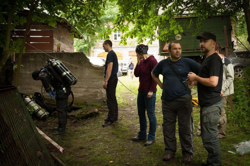 Niezależnie od prowadzonych nurkowań pojawił się w tym dniu jeszcze jeden ciekawy wątek – w odległości około 100 metrów znaleziony został ceglany szyb przykryty płytą, pod którą widoczna jest woda na około 10 metrach głębokości co sugeruje połączenie z eksplorowaną kopalnią. Niedziela przynosi próbę ustalenia czy to miejsce wciąż jest perspektywiczne. Do kopalni schodzi Piotr Dudziak, który ma sprawdzić czy woda wyklarowała się a chodniki nadają się do dalszej eksploracji. Nie przynosi on jednak dobrych dla nas wieści, w związku z czym odstępujemy od dalszych nurkowań. Tymczasem Mirek Kopertowski zanurza się w minimalistycznej wersji konfiguracji bocznej (ang. sidemount) by sprawdzić czy poniżej eksplorowanego przez nas poziomu kopalni znajduje się kolejny. Udaje mu się dotrzeć o 5 metrów niżej niż odwiedzone chodniki i stwierdzić, że szyb kontynuuje się w dół i przy lepszej widoczności można będzie podjąć próbę dotarcia na niższy poziom. Obecny na miejscu ekspert w dziedzinie górnictwa – Krzysztof Krzyżanowski stwierdza, że w tego typu obiektach odległość pomiędzy poziomami wynosiła zazwyczaj 10 metrów co oznacza jeszcze przynajmniej 5 metrowe przeciskanie się pomiędzy zawalonymi belkami. Bardzo prawdopodobne więc, że dalsza eksploracja tego miejsca zostanie zawieszona do czasu metodyczego oczyszczenia szybu ze wszystkich zalegających tam elementów.